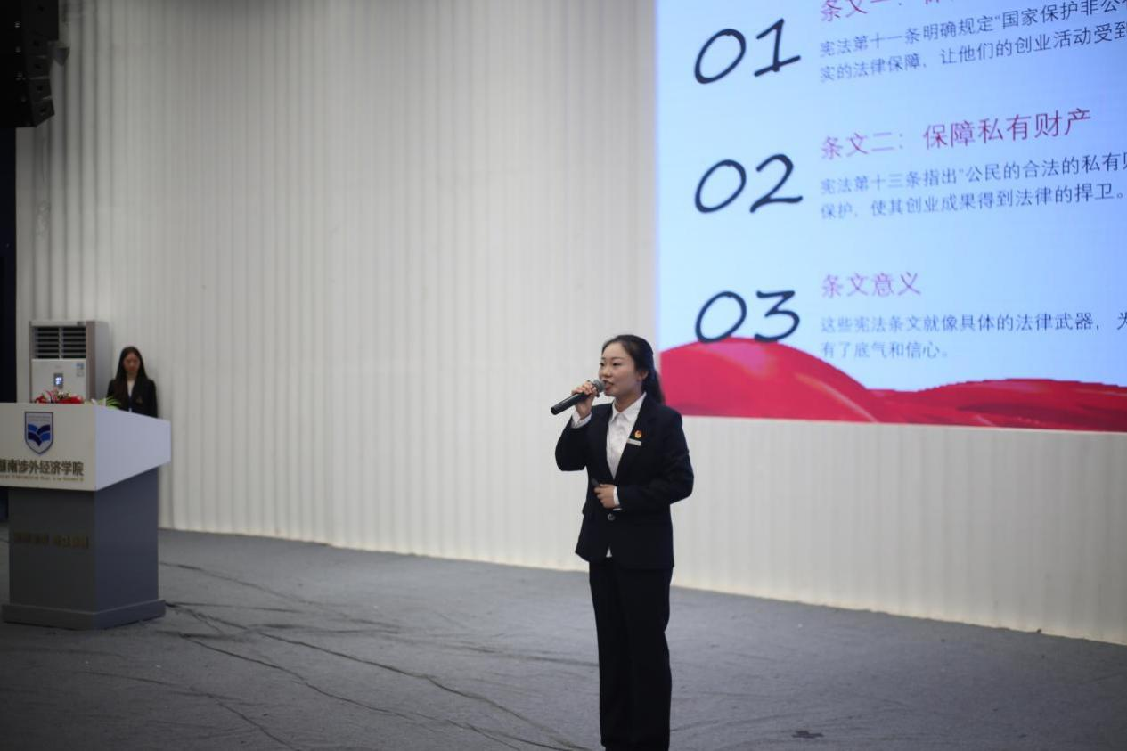 活动伊始,主持人介绍赛事背景、流程及评分标准,明确本次比赛旨在遴选符合省级赛事要求的优秀选手。随后,贾青彦院长致辞,强调此次选拔赛是对接省级赛事的重要环节,鼓励选手们展现专业素养与青春风采,通过赛事深化对宪法精神的理解,争取代表学校在省级舞台上斩获佳绩。致辞结束后,演讲比赛决赛正式拉开帷幕。