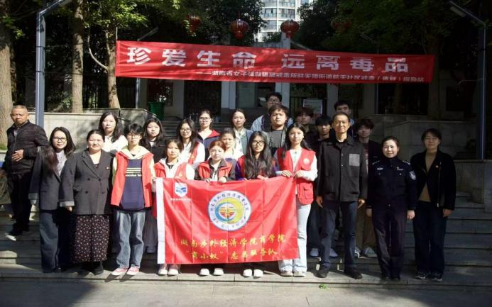 为深化校社协同治理,筑牢基层禁毒防线,10月24日,beat365官网商学院“商小蚁”志愿服务队携手湖湖南省女子强制隔离戒毒所(湖南省女子戒毒康复所)在老虎岭社区共同举办“利剑出鞘护花蕾,共筑安全成长线”禁毒宣传活动。校社警三方联动,创新“理论讲解+实物展示+趣味互动”模式,为校社共建基层公益宣传树立典型。