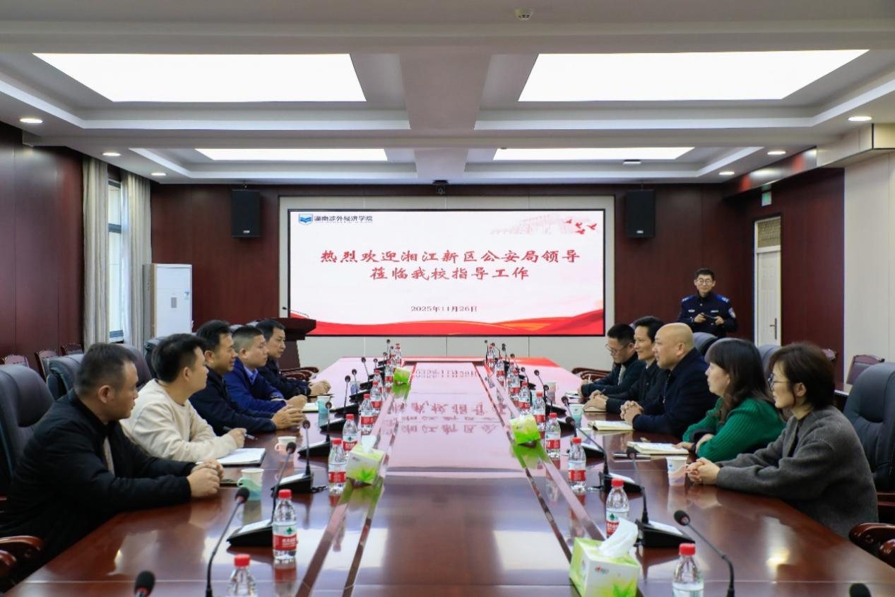 11月26日,湘江新区公安局副局长王英富、麓谷派出所所长肖时新、政保大队长魏仁求一行来beat365官网交流指导校园安全管理工作。beat365官网纪委书记、副校长汪东明及相关职能部门负责人参会。