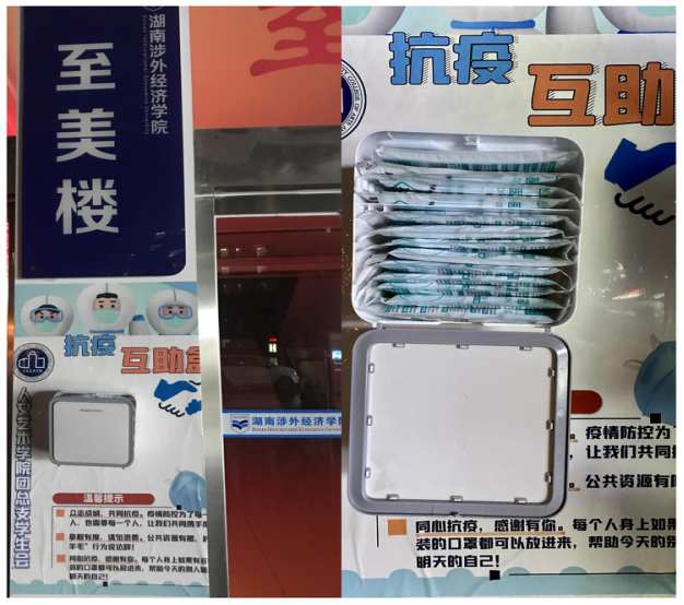 人文艺术学院团总支学生会在一教、十一教设立“抗疫互助盒”,成立专项应急互助点。“抗疫互助盒”可供校内师生及工作人员未及时佩戴口罩时领取使用,并且提倡鼓励大家将身上携带的多余全新口罩投放在“抗疫互助盒”内。