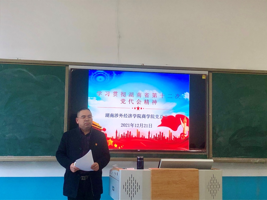 最后,他要求各位支部书记、党员老师要学习好、宣传好、贯彻好省第十二次党代会精神,要把学习贯彻省党代会精神,与学习贯彻党的十九届六中全会精神和习近平总书记对湖南重要讲话重要指示批示精神结合起来,带头学深悟透,一体推进落实,真正以“闯”的精神、“创”的劲头、“干”的作风,奋力争先进位,掀起学习贯彻热潮,在“一流涉外”建设中,彰显党员干部的担当作为。