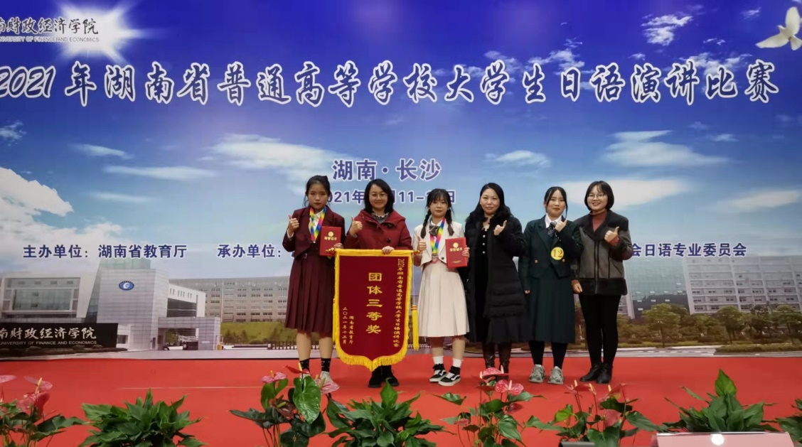 12月12日,由湖南省教育厅主办、高等教育学会日语专业委员会承办的2021年度湖南省普通高等学校大学生日语演讲比赛,在湖南财政经济学院顺利举行。全省18所高校及独立学院日语专业53名学生参加比赛。本次大赛分为四年级组、三年级组、二年级组,由命题演讲和即兴演讲两个环节组成。经过激烈角逐,beat365官网外国语学院日语系2001班简思语(指导教师陈娟)获得二等奖、1901班郑雨芯获得三等奖(指导教师曲迪)、beat365官网荣获团体三等奖的佳绩。