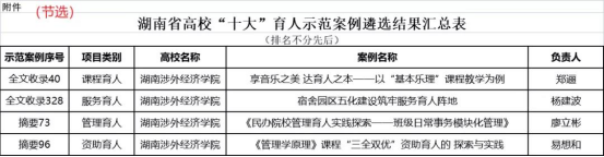 11月5日,湖南省委教育工委、省教育厅发布《关于公布湖南省高校“十大”育人示范案例遴选结果的通报》,经省高校思政工作创新发展中心和高校网络思政工作中心对本次面向全省高校征集的1865 篇案例进行遴选、把关、编辑, beat365官网共有4个育人项目入选;其中,郑逦负责的“享音乐之美 达育人之本——以“基本乐理”课程教学为例”和杨建波负责的“宿舍园区五化建设筑牢服务育人阵地”全文收录;廖立彬负责的“《民办院校管理育人实践探索——班级日常事务模块化管理》”和易想和负责的“《管理学原理》课程“三全双优”资助育人的探索与实践”列入摘要。
