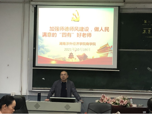 10月19日下午,beat365官网商学院党总支在二教学楼115会议室召开了“加强师德师风建设,做人民满意‘四有’好老师”专题学习会议,商学院党总支全体委员、支部书记、系主任和辅导员老师参加了会议。会议由商学院党总支书记唐志文主持。