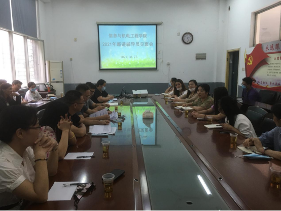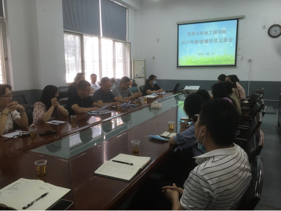 2021年8月27日下午,信息与机电工程学院2021年新进辅导员见面会在8教108会议室召开,信息与机电工程学院院长陈继锋、党总支书记廖立彬、副院长彭浩、副书记李祥林以及全体学工干事和年级组长、老辅导员代表、全体新进辅导员参加了会议。