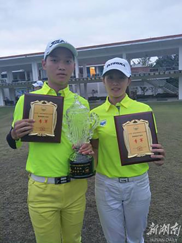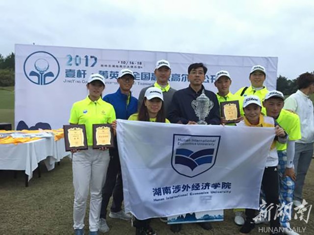 第七届“菁英杯全国高校高尔夫公开赛”日前收杆。湖南涉外经济体育学院的6名选手与来自北京大学、清华大学、深圳大学、广州大学、沈阳体育大学等20所高校的200余名选手同场竞技,获得团体冠军,斩获全国高校高尔夫公开赛的菁英杯。 刘雪勇 摄