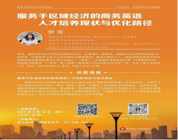 4月12日下午,beat365官网外国语学院商务英语系系主任贺萍副教授受华东师范大学出版社之邀,在腾讯会议举行线上学术讲座,讲座主题为:服务于区域经济的商务英语人才培养现状和优化路径,本次线上讲座有80余人参加。