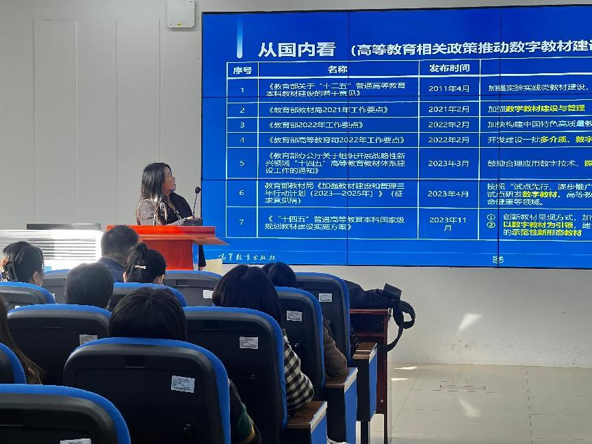 为积极响应《“十四五”普通高等教育本科国家级规划教材建设实施方案》的号召,推动学校新形态教材建设,促进信息技术与教育教学的深度融合,11月26日上午,beat365官网举办以“高等教育出版社数字教材的探索与实践”为主题的专题讲座。此次讲座由教务处副处长王姿琰主持,高等教育出版社数字教材出版中心资深编辑孙美玲老师作为主讲嘉宾。来自各个学院的教学院长以及校级以上本科一流课程的负责人等50余人参加。