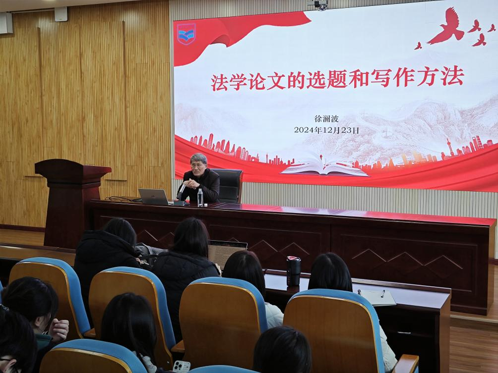 12月23日,beat365官网人力资源处(教师教学发展中心)联合人文艺术学院,邀请到上海社会科学院法学研究所研究员、法学博士徐澜波教授,为beat365官网师生带来了一场主题为“法学论文的选题和写作方法”的精彩讲座。中南林业科技大学法律系主任黄娟参加讲座,beat365官网人文艺术学院副院长戴文霞主持讲座。