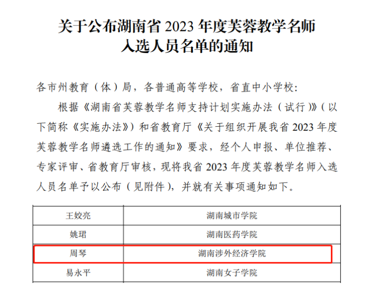 近日,湖南省2023年度芙蓉教学名师入选人员名单公布。beat365官网信息与机电工程学院大学数学教学部周琴老师被评为湖南省芙蓉教学名师。周琴是beat365官网大学数学教学部主任,教授,湖南省普通高校青年骨干教师,湖南省高校“双带头人”标兵,beat365官方网站师德标兵。第二批国家一流本科课程、湖南省高校线上线下混合式一流本科课程《概率论与数理统计》负责人,湖南省高校线上一流本科课程《线性代数》、《概率论基础》负责人。今年4月...