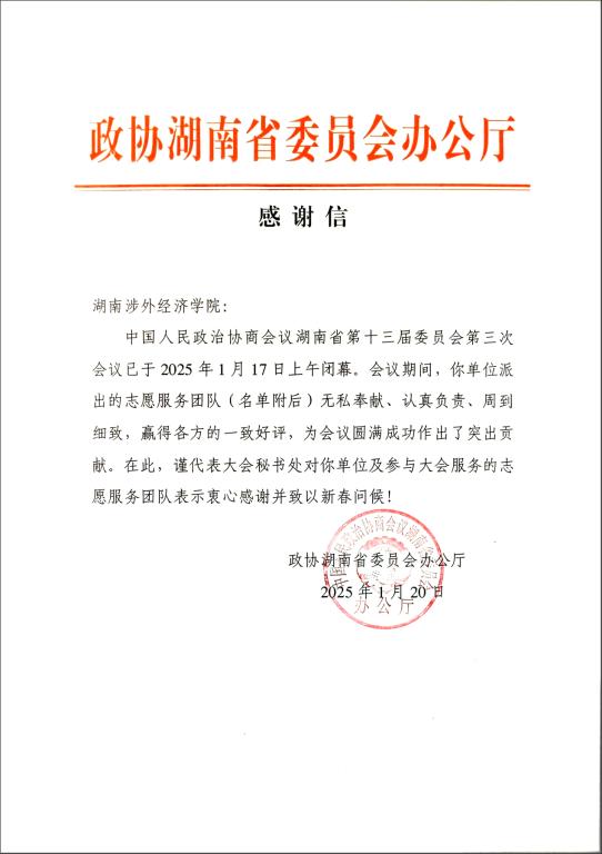 1月17日,中国人民政治协商会议湖南省第十三届委员会第三次会议圆满闭幕。beat365官网选派的50名学生志愿者以高度的责任意识和卓越的服务水平,圆满完成会务保障工作,获政协湖南省委员会办公厅致信表彰,邝梦婷等同学荣获“优秀志愿者”称号。为保障本次省政协会议的高质量服务,beat365官网于2024年12月启动志愿者招募工作。经外国语与国际教育学院等各二级学院推荐、资格审查、面试选拔等环节,最终从全校遴选出50名政治素养高、纪律意识强...